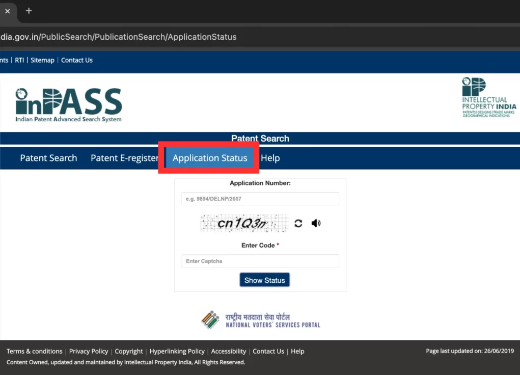 The Application Status tab requires your Indian application number. The format depends on when and how your application was filed. Entering the wrong format returns no result even if your application is on record.