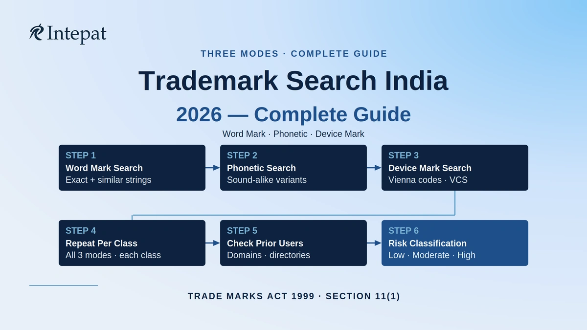 How to use this guide: This article explains how to assess trademark search results against the Section 11 conflict standard and how to classify filing risk. For step-by-step instructions on running the search on the public portal, see the trademark public search guide. For the trademark registration process that follows a successful search, see Trademark Registration in India.
